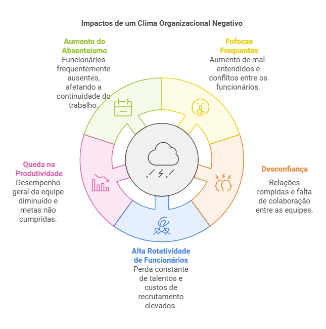 Já o clima ruim é o menos desejável, marcado por insatisfação, baixa produtividade e possível alta rotatividade de funcionários. Nesse ambiente, é comum haver conflitos, falta de comunicação efetiva e desmotivação generalizada.