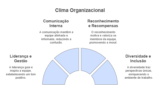 O clima organizacional é influenciado por diversos fatores, como liderança, comunicação, políticas da empresa, oportunidades de crescimento e relacionamentos interpessoais. Uma empresa com um bom clima tende a ter funcionários mais produtivos, engajados e leais.