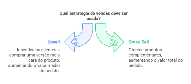• Upsell mira para cima: oferece uma versão melhor ou mais cara do mesmo produto. • Cross sell olha para os lados: sugere produtos diferentes, mas complementares.