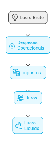 Lucro Líquido = Lucro Bruto - Despesas Operacionais - Impostos - Juros